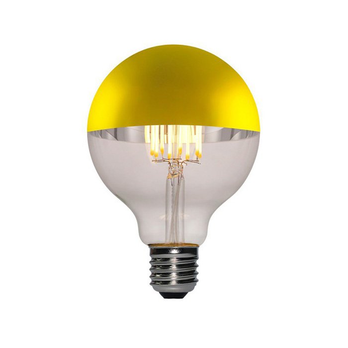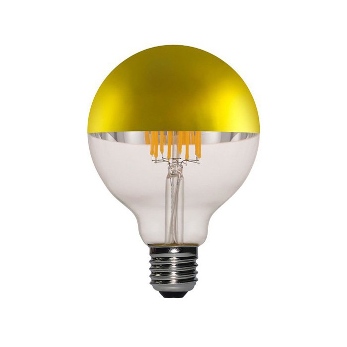 Ściemnialna żarówka lustrzana E27 o oznaczeniu Dome Gold i mocy 7,5 W to ozdobne energooszczędne źródło światła. Ze względu na popularny kształt szklanej bańki G95 (Globe - w najszerszym miejscu Ø 95 mm), stanowi ona świetną alternatywę dla wszystkich wiszących opraw oświetleniowych mających oprawki E27. To, co sprawia, że żarówka Dome Gold jest niezwykłym elementem dekoracji oświetleniowej, to złota lustrzana kopuła. Zacieniona górna część żarówki powoduje, że emitowane światło przenika do pomieszczenia tylko przez przezroczysty szklany obwód żarówki. Ściemnialna żarówka lustrzana G95 z niekierunkową emisją światła jest stosowana w celu uzyskania nieoślepiających efektów oświetleniowych ze światłem o następujących właściwościach :