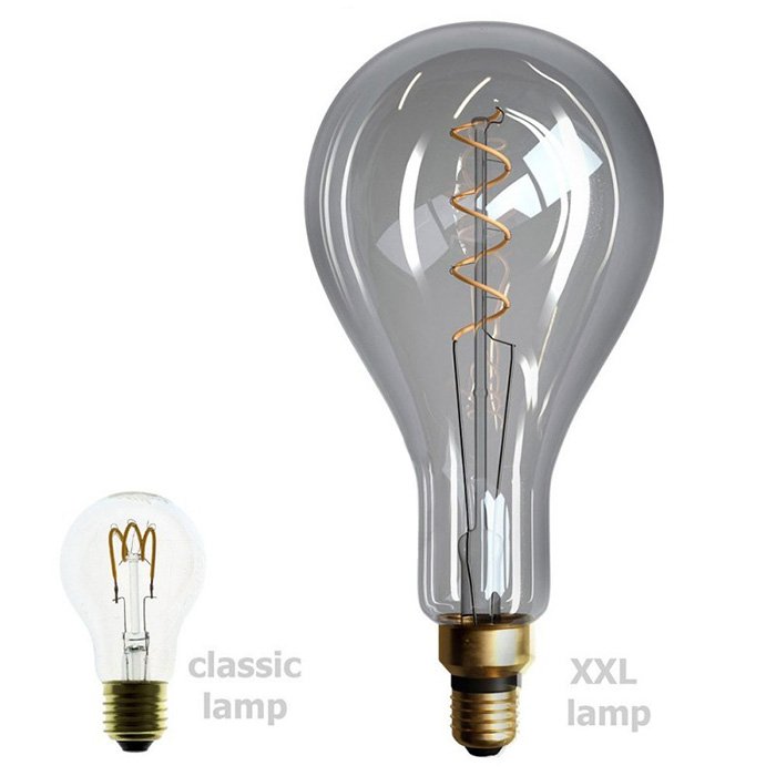 Ściemnialna czarna żarówka E27 o oznaczeniu Spiral Smoky XXL i mocy 5 W to wyjątkowo dekoracyjne i nowoczesne źródło światła. Ze względu na popularny kształt dymionej szklanej bańki A165 (Pear - w najszerszym miejscu Ø 165 mm), stanowi ona świetną alternatywę dla wszystkich wiszących opraw oświetleniowych mających oprawki E27. Tym, co czyni żarówkę Spiral Smoky XXL niezwykłym elementem dekoracji oświetleniowej w stylu nowoczesnym, jest spiralny kształt żarnika. Prawdziwym arcydziełem jest także dymione wykończenie szklanej bańki. Po zapaleniu czarnej żarówki XXL widoczne stają się zalety obu technologii produkcji, które przyciągają uwagę. Połączenie spiralnego żarnika i dymionego szkła żarówki A165 Spiral Smoky XXL daje oświetlenie sceniczne i harmonijne o następującej charakterystyce: