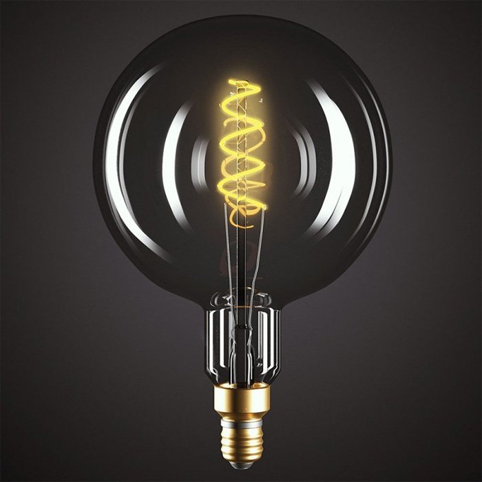 Ściemnialna czarna żarówka E27 o oznaczeniu Spiral Smoky XXL i mocy 5 W to wyjątkowo dekoracyjne i nowoczesne źródło światła. Ze względu na popularny kształt dymionej szklanej bańki G200 (Globe - w najszerszym miejscu Ø 200 mm), stanowi ona świetną alternatywę dla wszystkich wiszących opraw oświetleniowych mających oprawki E27. Tym, co czyni żarówkę Spiral Smoky XXL niezwykłym elementem dekoracji oświetleniowej w stylu nowoczesnym, jest spiralny kształt żarnika. Prawdziwym arcydziełem jest także dymione wykończenie szklanej bańki. Po zapaleniu czarnej żarówki XXL widoczne stają się zalety obu technologii produkcji, które przyciągają uwagę. Połączenie spiralnego żarnika i dymionego szkła żarówki G200 Spiral Smoky XXL daje oświetlenie sceniczne i harmonijne o następującej charakterystyce: