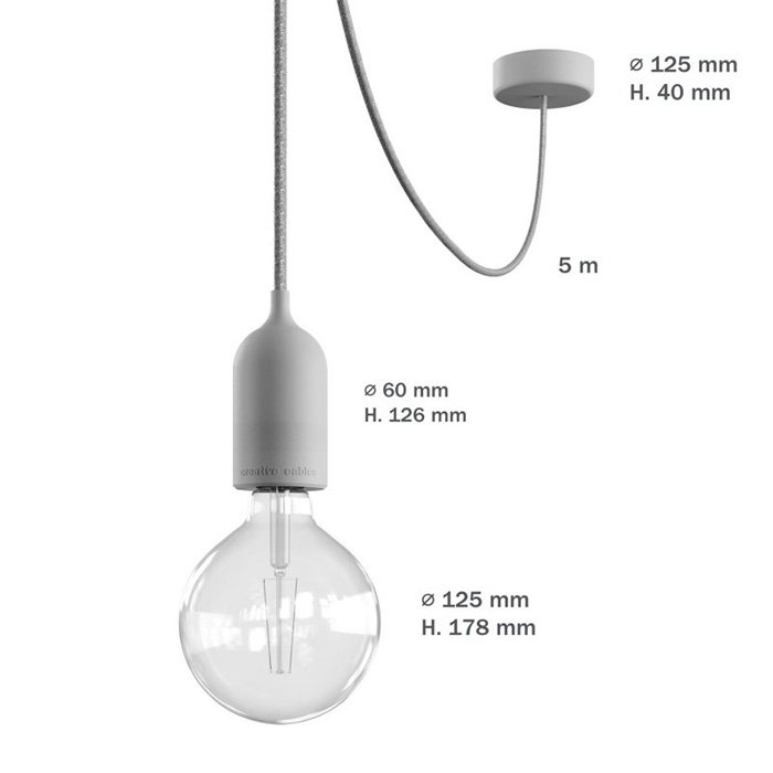 - Kabel tekstylny IP65 2x 1 mm o długości ≈ 5 m – o okrągłym wykonaniu i kolorze, który idealnie pasuje do pozostałych elementów. Długość można łatwo skrócić w zależności od potrzeb przestrzeni.