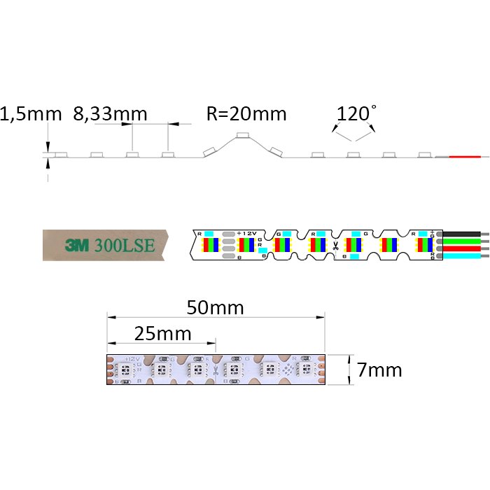 Taśma LED RGB 12V ZIG-ZAG Lux Miners o oznaczeniu produktu RGB12120E to produkt o doskonałych parametrach świetlnych i właściwościach mechanicznych. Termin ZIG-ZAG lub S-Bend RGB LED Strip odnosi się do bardzo elastycznej bocznie taśmy LED o specjalnej perforowanej konstrukcji o szerokości zaledwie 7 mm. Zaletą technologii RGB, która obejmuje trzy podstawowe kolory (czerwony, zielony, niebieski), jest możliwość tworzenia szerokiego spektrum kolorów do oświetlenia dekoracyjnego lub efektów świetlnych. Od początkowego projektu technicznego do końcowej produkcji, skupiono się na uzyskaniu wysokiej wydajności (lm/W), wykonaniu produktu i designowi o wysokiej jakości, przeznaczonym do szerokiej gamy zastosowań, w tym do produkcji napisów LED NEON i grafik.